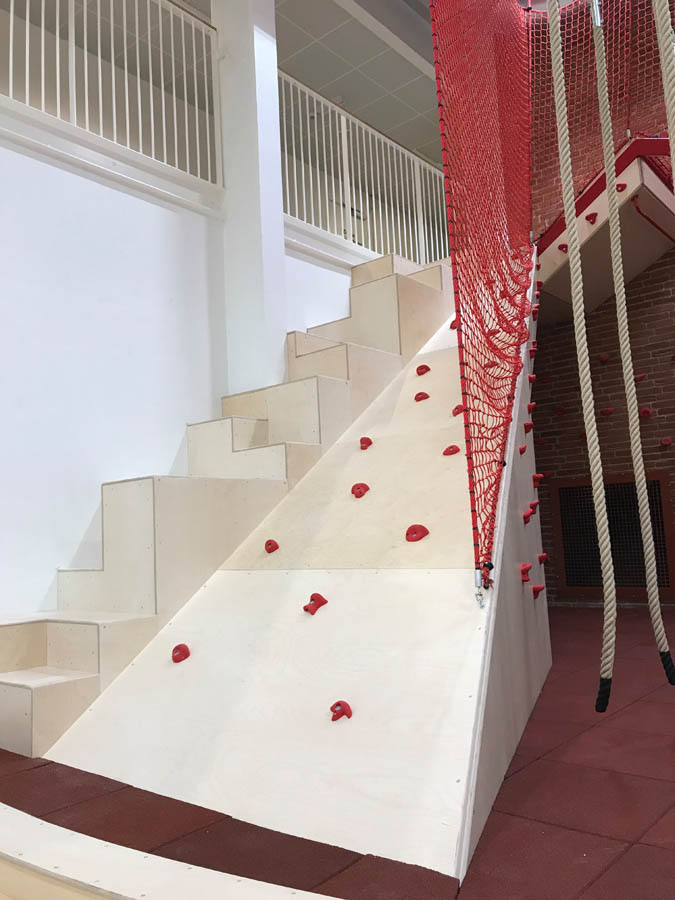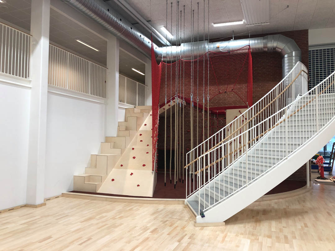 Med klatretrappe, reb, gangbro med ribber samt motoriknet har Unisport skabt et spændende idrætsareal i et "dødt" rum bag en trappe. Et motorik landskab som inspirerer børn og unge til at bevæge sig, få pulsen i vejret og sved på panden. Projektet tager udgangspunkt i en udvidelse og modernisering af idrætshallen, for at skabe et fælles samlingspunkt med plads til idræt og bevægelse.