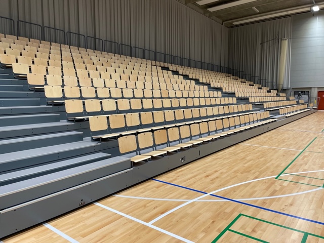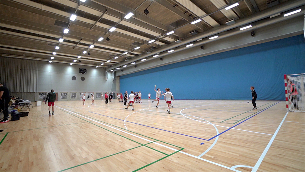 Sportsgulvet består af Junckers Duo-bat 120 + strøopbygget sportsgulv med en belægning af 22 mm massiv pressetørret Bøgeparket, og der er lavet ekstra forstærkning i det strøopbygget sportsgulv, grundet belastningen af de store mobile teleskoptribuner.