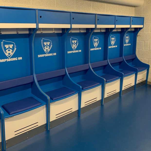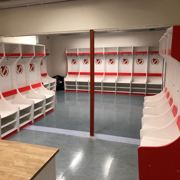 Till Olympia i Helsingborg har vi levererat skåp med generösa förvaringsytor för varje spelare. På dessa omklädningsmoduler har man valt överhyllor samt sittbänkar och dubbla skohyllor.
